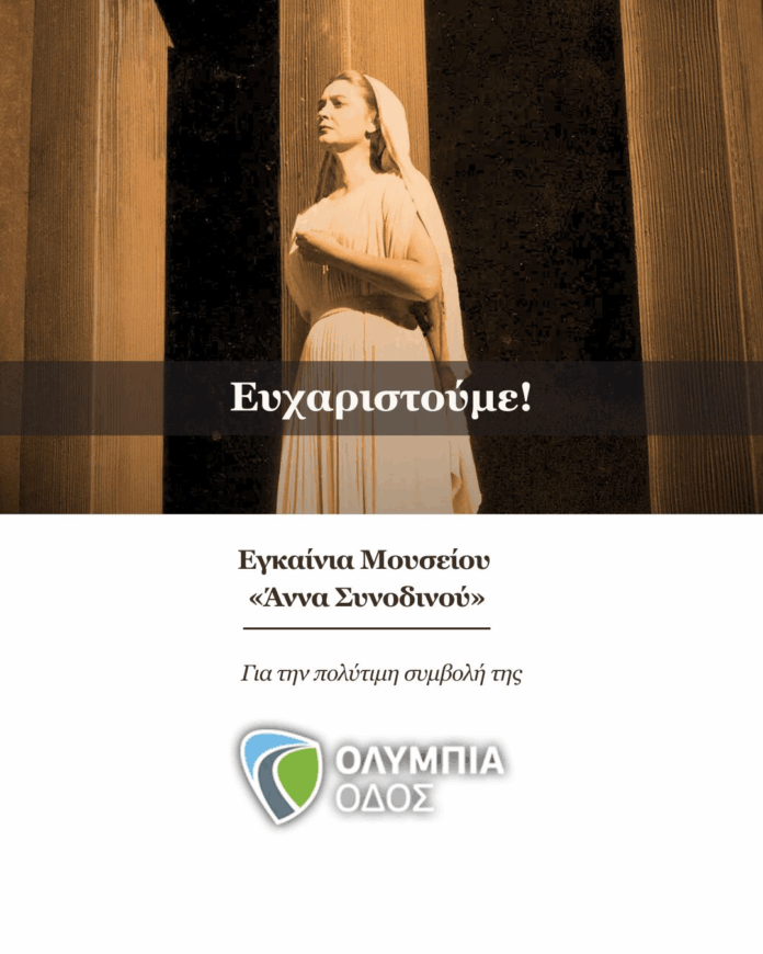 Με μεγάλη επιτυχία πραγματοποιήθηκαν τα εγκαίνια του Μουσείου «Άννα Συνοδινού», με την πολύτιμη στήριξη της ΟΛΥΜΠΙΑ ΟΔΟΣ Α.Ε., η οποία για ακόμη μία φορά απέδειξε έμπρακτα την προσήλωσή της στην τοπική κοινωνία και στον πολιτισμό.