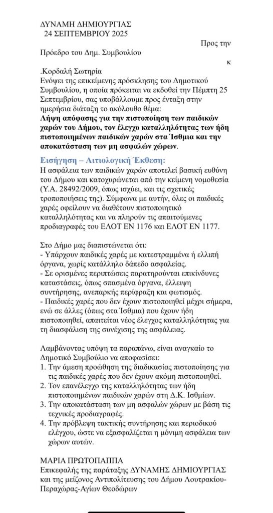 Αίτημα προς της Πρόεδρο του ΔΣ , Σωτηρία Κορδαλή, κατέθεσε η ΔΥΝΑΜΗ ΔΗΜΙΟΥΡΓΙΑΣ με επικεφαλής την Μαρία Πρωτοπαππά. Αφορά στις μη πιστοποιημένες παιδικές χαρές του δήμου μας, θέμα για το οποίο έγραψε σχετικά και το Loutrakiblog, μετα τα όσα είπε ο ίδιος ο Σωτήρης Πέρρας στο ΔΣ, καθ ύλην αρμόδιος αντιδήμαρχος. Παιδικές χαρές: Μόνο 3 με πιστοποίηση και… οι 3 στα Ισθμια!
