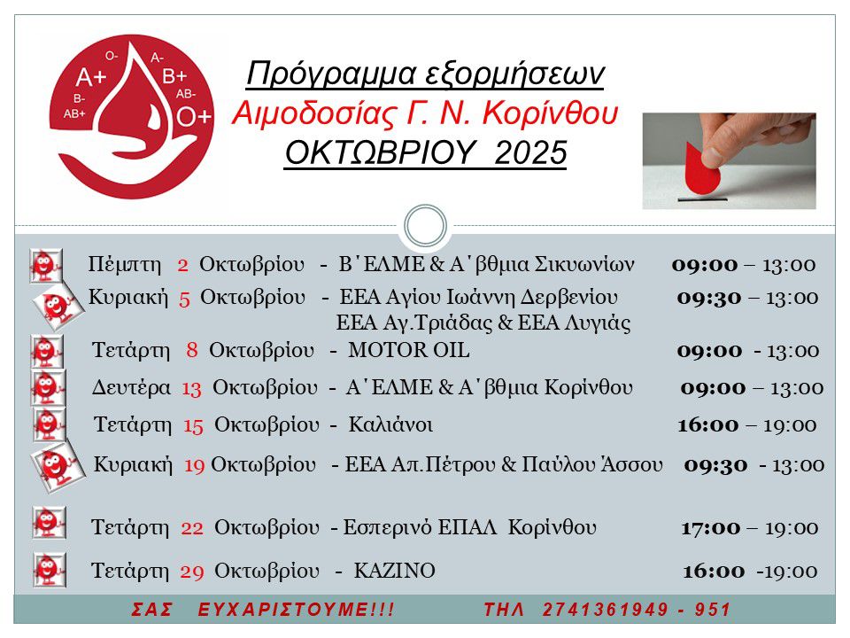 ΤΟΠΙΚΑΚορινθία Κόρινθος: Πρόγραμμα αιμοδοσιών για τον Οκτώβριο ημερομηνίες και περιοχές 5 Οκτωβρίου 2025, 18:00 FacebookTwitterEmailCopy URLΤυπώνω - Advertisement - Ο Οκτώβρης τρέχει κι εμείς ως Αιμοδοσία Κορίνθου σε όλες τις πόλεις και τα χωριά. Σας περιμένουμε! ΠΡΟΣΟΧΗ! Μην ξεχάσετε το υπέροχο χαμόγελο σας! - Advertisement - ΕΤΙΚΕΤΕΣΚΟΡΙΝθΙΑΠΡΟΓΡΑΜΜΑ ΑΙΜΟΔΟΣΙΩΝΔΗΜΟΣ ΚΟΡΙΝΘΙΩΝ ΑΦΗΣΤΕ ΜΙΑ ΑΠΑΝΤΗΣΗ Ακύρωση απάντησης Σχόλιο: εισάγετε το σχόλιό σας! Όνομα: παρακαλώ εισάγετε το όνομά σας εδώ Email: έχετε εισάγει εσφαλμένη διεύθυνση ηλεκτρονικού ταχυδρομείου! παρακαλώ εισάγετε εδώ την ηλεκτρονική σας διεύθυνση Ιστοσελίδα: αποθηκεύστε το όνομα, το ηλεκτρονικό ταχυδρομείο και τον ιστότοπό μου σε αυτό το πρόγραμμα περιήγησης για την επόμενη φορά που θα σχολιάσω. Δ Δείτε ακόμα Κορινθία Βράβευση των μαθητών του Δημοτικού Σχολείου Βέλου στον μαθηματικό διαγωνισμό «Μικρός Ευκλείδης» και «Πυθαγόρας» (ΦΩΤΟ) Λουτράκι Θύελλα Πετρίου – Άγιοι Θεόδωροι 1-1 Διεθνή Ρωσία: 25χρονος τρέχει με 300 χλμ./ώρα και…καρφώθηκε κάτω από νταλίκα! (ΒΙΝΤΕΟ ΣΟΚ) ΤΟΠΙΚΑ Κόρινθος: Όσα έγραψε το «κοντέρ» Σταυρέλη για την προηγούμενη εβδομάδα ΤΟΠΙΚΑ Σημαντικές Ανακοινώσεις από Σταυρέλη: Ανάπλαση και Αναβάθμιση του Δικαστικού Μεγάρου Σχετικά άρθρα Λουτράκι Θύελλα Πετρίου – Άγιοι Θεόδωροι 1-1 Κορινθία Βράβευση των μαθητών του Δημοτικού Σχολείου Βέλου στον μαθηματικό διαγωνισμό «Μικρός Ευκλείδης» και «Πυθαγόρας» (ΦΩΤΟ) ΤΟΠΙΚΑ Κόρινθος: Όσα έγραψε το «κοντέρ» Σταυρέλη για την προηγούμενη εβδομάδα ΤΟΠΙΚΑ Σημαντικές Ανακοινώσεις από Σταυρέλη: Ανάπλαση και Αναβάθμιση του Δικαστικού Μεγάρου