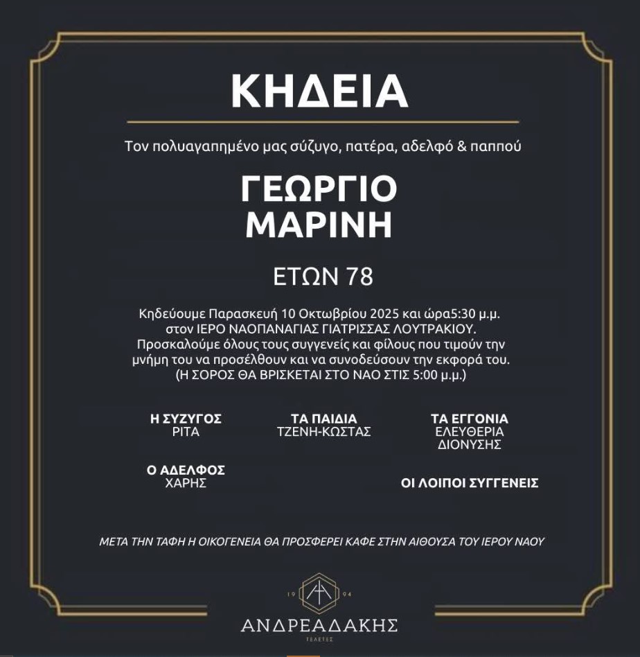 Έφυγε από τη ζωή ο Γιώργος Μαρίνης, πρώην πρόεδρος του Εμπορικού Συλλόγου Λουτρακίου, επιχειρηματίας και άνθρωπος με βαθιά δράση στα κοινά.