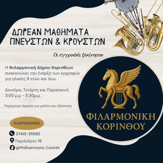 Ο Δήμος Κορινθίων, στο πλαίσιο της πολιτιστικής του προσφοράς και με στόχο την καλλιέργεια της μουσικής παιδείας στις νεότερες γενιές, ανακοινώνει την έναρξη των δωρεάν μαθημάτων πνευστών και κρουστών οργάνων της Φιλαρμονικής Δήμου Κορινθίων.