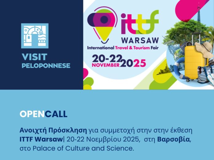 Η Περιφέρεια Πελοποννήσου θα συμμετάσχει ως Συνεκθέτης του ΕΟΤ στην έκθεση ITTF Warsaw 2025 (International Travel & Tourism Fair), με δικό της booth εντός του περιπτέρου του ΕΟΤ, και προσκαλεί όλους τους ενδιαφερόμενους φορείς, δήμους και τουριστικές επιχειρήσεις της Πελοποννήσου να δηλώσουν συμμετοχή.