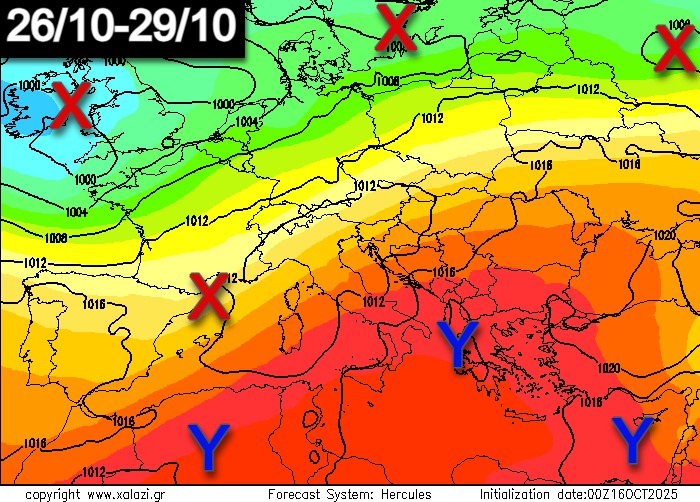 Στον παρακάτω χάρτη που ετοίμασε η ομάδα μας διακρίνουμε με ”Χ” τα Βαρομετρικά Χαμηλά που θα απασχολούν εκείνο το διάστημα την Δυτική και Βόρεια Ευρώπη ενώ με ”Υ” βλέπουμε τις Καλοκαιρινές συνθήκες που θα έχει η Ανατολική Μεσόγειος αλλά και η χώρα μας με θερμοκρασίες που θα κυμαίνονται μεταξύ 25-30 βαθμών μακριά από την θάλασσα και τα βουνά.
