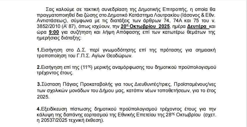 Ενδιαφέρον παρουσιάζουν τα θέματα της δημοτικής επιτροπής του δήμου Λουτρακίου-Περαχώρας-Αγίων Θεοδώρων.