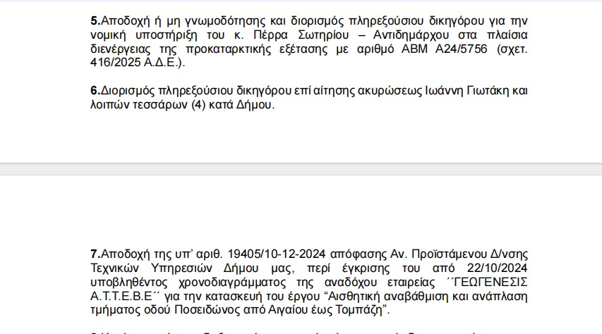 Το 6ο θέμα παρουσιάζει ιδιαίτερο ενδιαφέρον αφού ο τέως δήμαρχος Γιάννης Γιωτάκης και τέσσερις ακόμα, έχουν προσφύγει στα δικαστήρια με αίτηση ακυρώσεως. Εχει ενδιαφέρον να μάθουμε το λόγο!