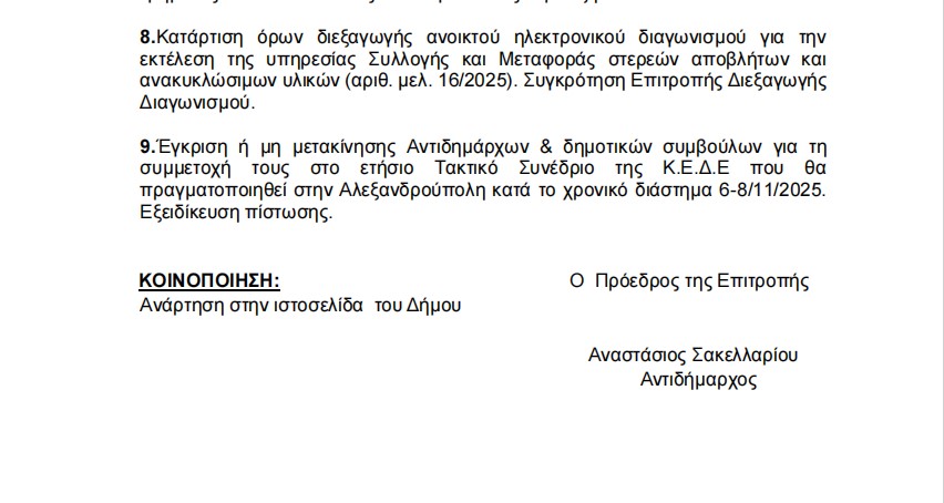 Το 9ο θέμα αφορά στην έγκριση μετακίνησης αντιδημάρχων και συμβούλων στο συνέδριο της ΚΕΔΕ. Μαθαίνω ότι τελικά για πρώτη φορά θα πανε και σύμβουλοι της αντιπολίτευσης.