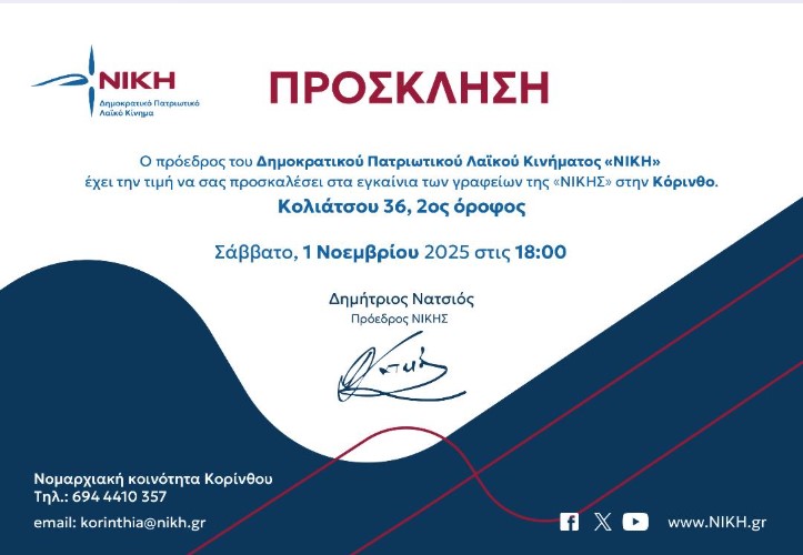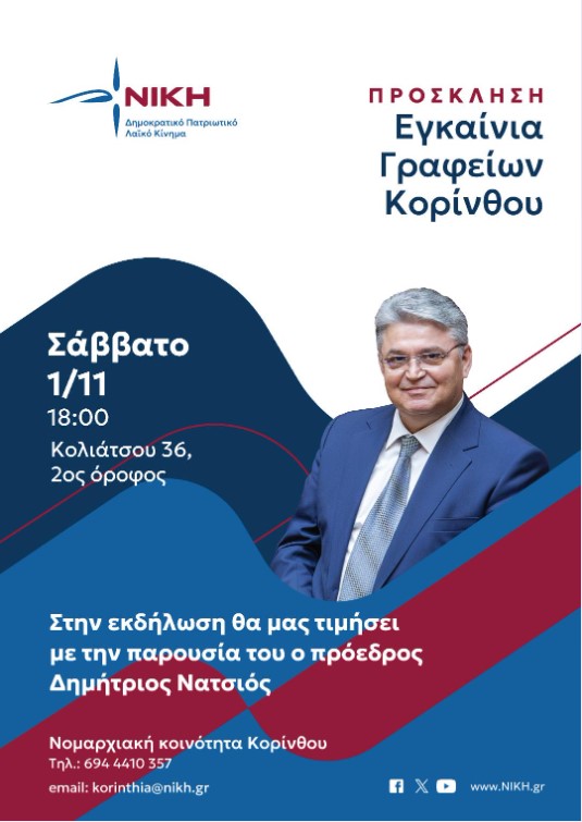 Στα εγκαίνια θα δώσει το παρών ο πρόεδρος της Νίκης Δημήτρης Νατσιός όπως και ο Κορίνθιος Αντιπρόεδρος Γιώργος Ρούντας.