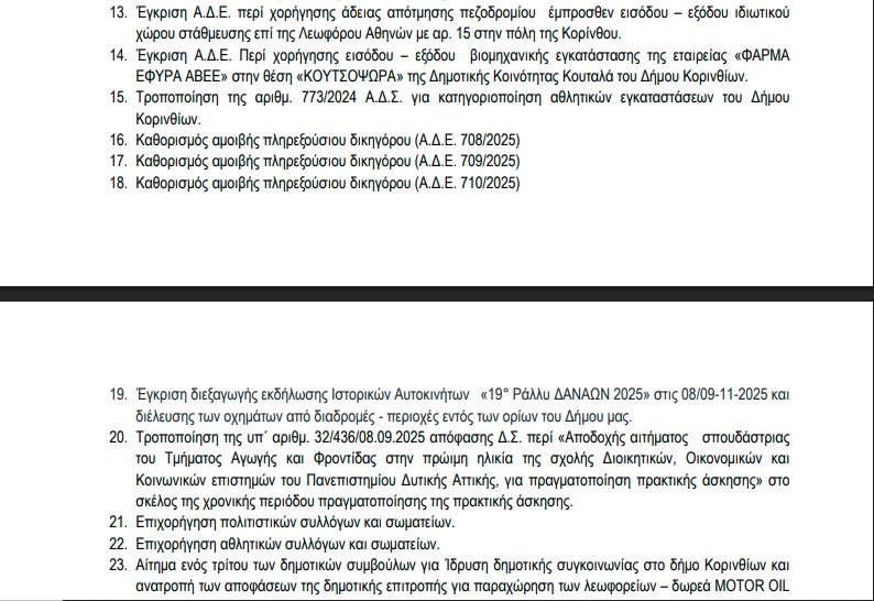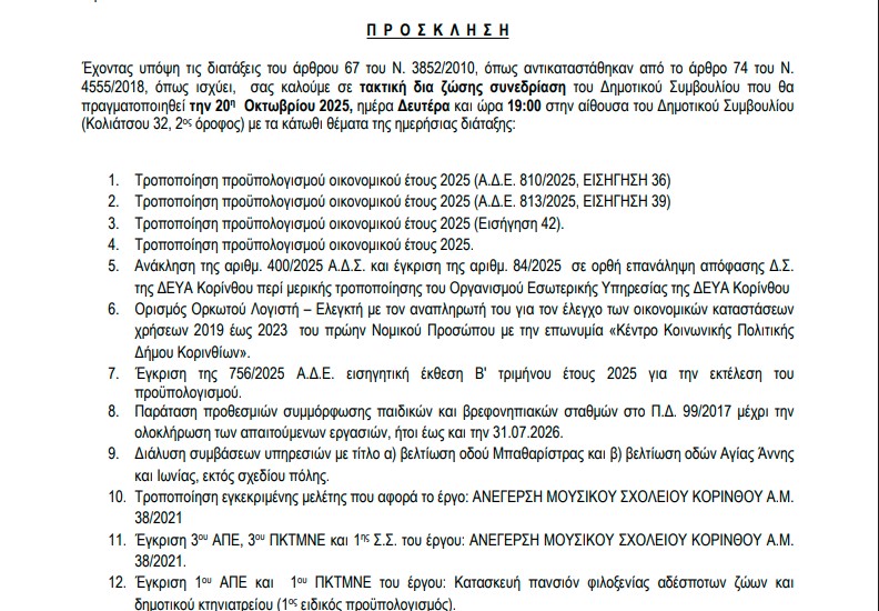 Κυριότερες Τοπικές ειδήσειςΤΟΠΙΚΑΔημοτικά ΣυμβούλιαΚορινθία Συνεδριάζει το δημοτικό συμβούλιο στην Κόρινθο 17 Οκτωβρίου 2025, 09:45 FacebookTwitterEmailCopy URLΤυπώνω - Advertisement - Συνεδριάζει το δημοτικό συμβούλιο του δήμου Κορινθίων. Τη Δευτέρα 20 Οκτωβρίου 2025, ώρα 19.00 μμ. Δείτε τα θέματα - Advertisement - 1 ΣΧΟΛΙΟ Να δούμε τι λαγούς θα βγάλει… Απάντηση ΑΦΗΣΤΕ ΜΙΑ ΑΠΑΝΤΗΣΗ Ακύρωση απάντησης Σχόλιο: εισάγετε το σχόλιό σας! Όνομα: παρακαλώ εισάγετε το όνομά σας εδώ Email: έχετε εισάγει εσφαλμένη διεύθυνση ηλεκτρονικού ταχυδρομείου! παρακαλώ εισάγετε εδώ την ηλεκτρονική σας διεύθυνση Ιστοσελίδα: αποθηκεύστε το όνομα, το ηλεκτρονικό ταχυδρομείο και τον ιστότοπό μου σε αυτό το πρόγραμμα περιήγησης για την επόμενη φορά που θα σχολιάσω. Δ Δείτε ακόμα Λουτράκι Ολοκληρώθηκε το 20ό Διεθνές Φεστιβάλ Υπερμαραθωνίων Δρόμων στο Λουτράκι (ΦΩΤΟ) Λουτράκι Λουτράκι: Συνεδριάζει το Δημοτικό Συμβούλιο την Παρασκευή 24 Οκτωβρίου Κορινθία Γ. Ψυχογιός: Επικίνδυνη, οπισθοδρομική και πανάκριβη η καύση στην διαχείριση των αποβλήτων! ΤΟΠΙΚΑ Δήμος Σικυωνίων: Λογοδοτεί η Δημοτική Αρχή την Παρασκευή 31 Οκτωβρίου Δημοτικά Συμβούλια Βέλο – Βόχα: Λογοδοτεί η Δημοτική Αρχή την Πέμπτη 30 Οκτωβρίου Σχετικά άρθρα Λουτράκι Ολοκληρώθηκε το 20ό Διεθνές Φεστιβάλ Υπερμαραθωνίων Δρόμων στο Λουτράκι (ΦΩΤΟ) Λουτράκι Λουτράκι: Συνεδριάζει το Δημοτικό Συμβούλιο την Παρασκευή 24 Οκτωβρίου Κορινθία Γ. Ψυχογιός: Επικίνδυνη, οπισθοδρομική και πανάκριβη η καύση στην διαχείριση των αποβλήτων! ΤΟΠΙΚΑ Δήμος Σικυωνίων: Λογοδοτεί η Δημοτική Αρχή την Παρασκευή 31 Οκτωβρίου