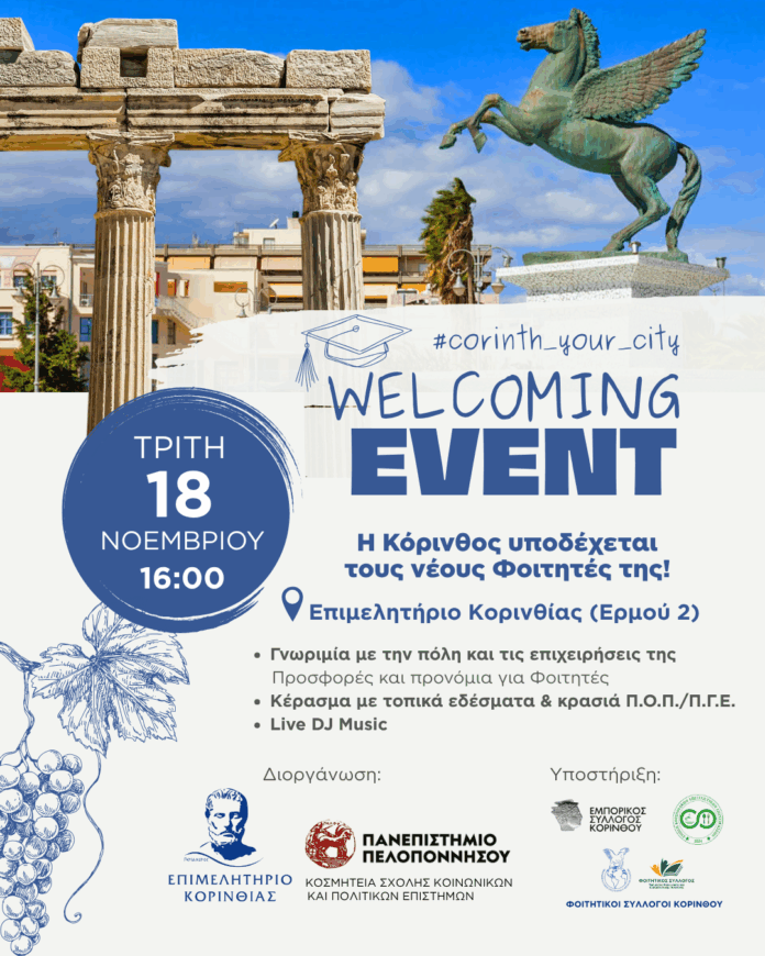 Στο πλαίσιο του Welcoming Event – “Η Κόρινθος υποδέχεται τους νέους φοιτητές της”, που θα πραγματοποιηθεί την Τρίτη 18 Νοεμβρίου 2025, ώρα 16:00, στο Επιμελητήριο Κορινθίας (Ερμού 2), προσκαλούνται οι επιχειρήσεις της πόλης να δηλώσουν συμμετοχή προσφέροντας εκπτώσεις, προνόμια ή ειδικές προσφορές στους φοιτητές των τμημάτων:
