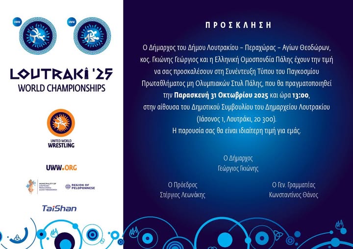 Ο Δήμαρχος Λουτρακίου – Περαχώρας – Αγίων Θεοδώρων, κ. Γιώργος Γκιώνης, και η Ελληνική Ομοσπονδία Πάλης σας προσκαλούν στη Συνέντευξη Τύπου του Παγκοσμίου Πρωταθλήματος Μη Ολυμπιακών Στυλ Πάλης.