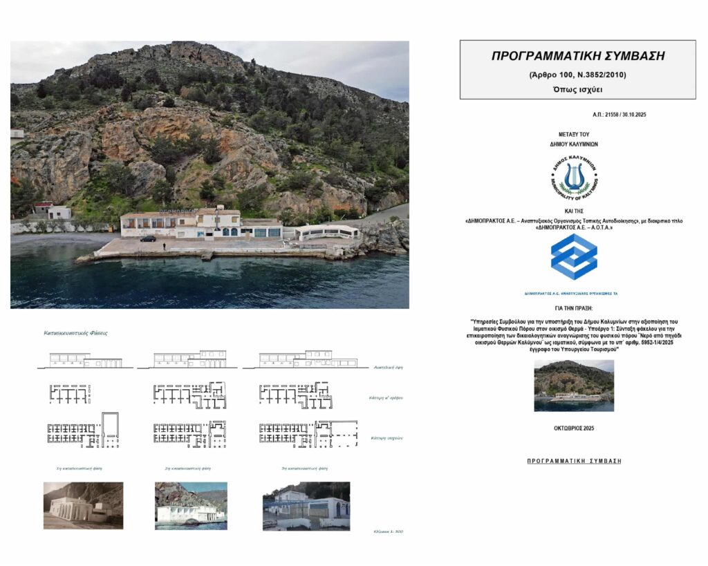 Ο Δήμος Καλυμνίων, έχοντας ως στόχο την πλήρη αξιοποίηση του φυσικού ιαματικού πόρου «Νερό από πηγάδι Θερμών Καλύμνου» και στο πλαίσιο της τουριστικής ανάπτυξης του και στον τομέα του Ιαματικού τουρισμού, διαμέσου της «ΔΗΜΟΠΡΑΚΤΟΣ ΑΕ» ΑΟ ΤΑ, στην παρούσα φάση θα επικαιροποιήσει το φάκελο αναγνώρισης του φυσικού πόρου έτσι ώστε να υποβληθεί αρμοδίως στο Υπουργείο Τουρισμού και να λάβει τις σχετικές εγκρίσεις.