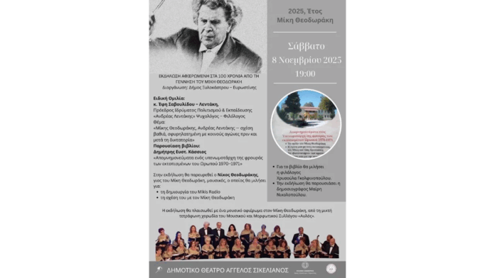 Ο Δήμος Ξυλοκάστρου – Ευρωστίνης, σε συνεργασία με τον συγγραφέα Δημήτρη Ευστ. Κάσσιο, τιμά τον Μίκη Θεοδωράκη με αφορμή τη συμπλήρωση 100 χρόνων από τη γέννησή του, διοργανώνοντας μια ξεχωριστή εκδήλωση στο Δημοτικό Θέατρο “Άγγελος Σικελιανός” το Σάββατο 8 Νοεμβρίου 2025, ώρα 19:00.