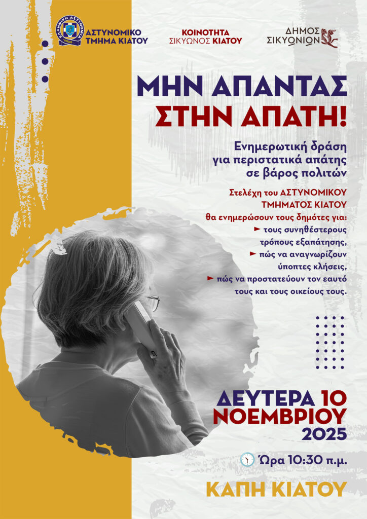«Μην Απαντάς στην Απάτη»: Ενημερωτική δράση στο Κιάτο για τις σύγχρονες μορφές εξαπάτησης