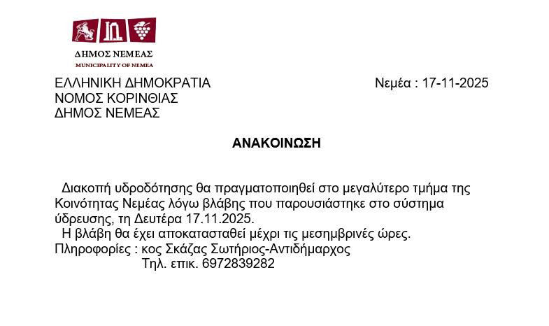 ΤΟΠΙΚΑΚορινθία Διακοπή νερού στη Νεμέα λόγω βλάβης 17 Νοεμβρίου 2025, 11:46 FacebookTwitterEmailCopy URLΤυπώνω - Advertisement - - Advertisement - ΑΦΗΣΤΕ ΜΙΑ ΑΠΑΝΤΗΣΗ Ακύρωση απάντησης Σχόλιο: εισάγετε το σχόλιό σας! Όνομα: παρακαλώ εισάγετε το όνομά σας εδώ Email: έχετε εισάγει εσφαλμένη διεύθυνση ηλεκτρονικού ταχυδρομείου! παρακαλώ εισάγετε εδώ την ηλεκτρονική σας διεύθυνση Ιστοσελίδα: αποθηκεύστε το όνομα, το ηλεκτρονικό ταχυδρομείο και τον ιστότοπό μου σε αυτό το πρόγραμμα περιήγησης για την επόμενη φορά που θα σχολιάσω. Δ Δείτε ακόμα ΤΟΠΙΚΑ ΔΗΜΟΣ ΒΕΛΟΥ-ΒΟΧΑΣ: Yπάρχει σχέδιο διαχείρισης των αδέσποτων ζώων Διεθνή Γερμανικά ΜΜΕ: Η Ελλάδα καθίσταται ενεργειακός κόμβος Ελλάδα Η Ράνια Καρατζαφέρη είναι η δημοσιογράφος που συνελήφθη για το επεισόδιο με τους αστυνομικούς ΤΟΠΙΚΑ Παρουσία της ΝΙΚΗΣ στην ενθρόνιση του Μητροπολίτη (ΦΩΤΟ-ΒΙΝΤΕΟ) Δημοτικά Συμβούλια Ψήφισμα του Δήμου Κορινθίων για το κλείσιμο του γραφείου των ΕΛΤΑ Σοφικού Σχετικά άρθρα ΤΟΠΙΚΑ ΔΗΜΟΣ ΒΕΛΟΥ-ΒΟΧΑΣ: Yπάρχει σχέδιο διαχείρισης των αδέσποτων ζώων ΤΟΠΙΚΑ Παρουσία της ΝΙΚΗΣ στην ενθρόνιση του Μητροπολίτη (ΦΩΤΟ-ΒΙΝΤΕΟ) Δημοτικά Συμβούλια Ψήφισμα του Δήμου Κορινθίων για το κλείσιμο του γραφείου των ΕΛΤΑ Σοφικού ΤΟΠΙΚΑ ΔΗΜΟΣ ΒΕΛΟΥ ΒΟΧΑΣ: Kλειστό σήμερα το Κέντρο Τεχνών και Πολιτισμού