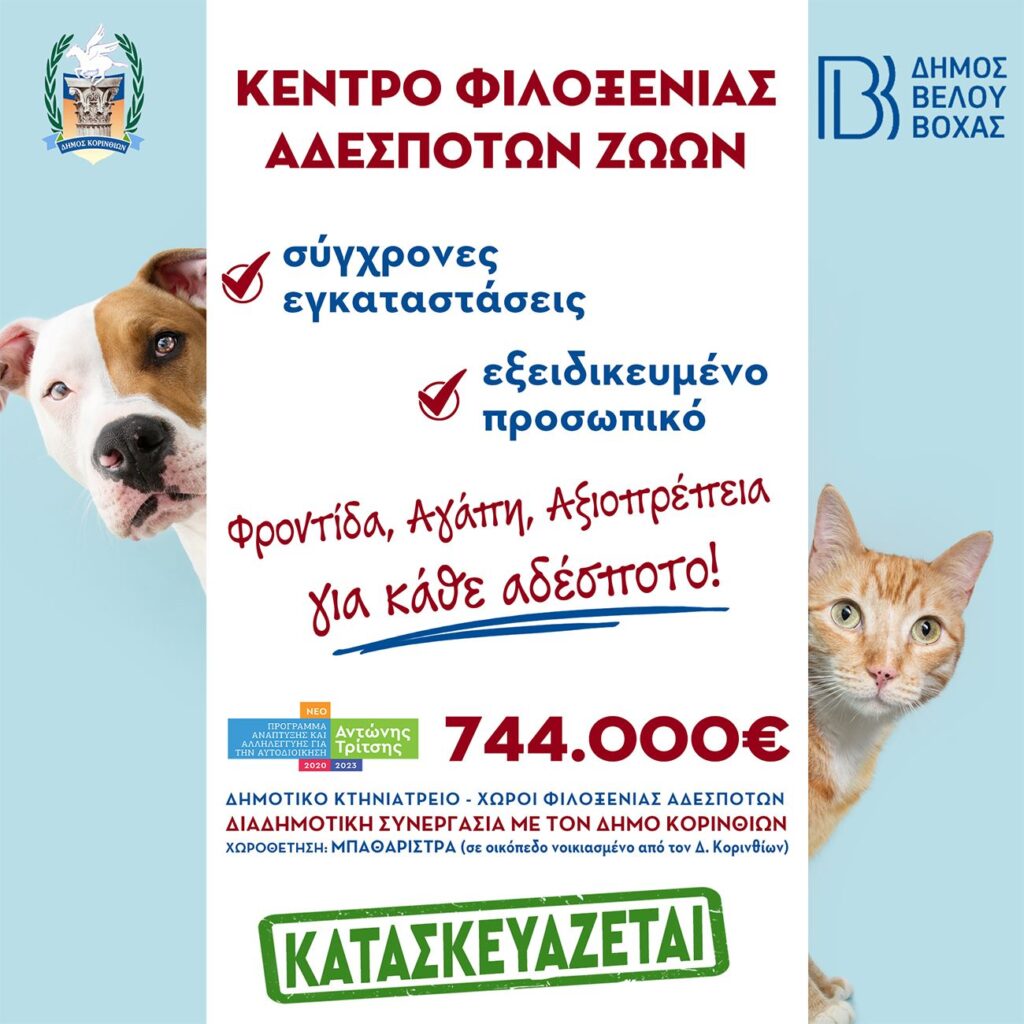 Το λέμε συνέχεια και θα το λέμε κάθε μέρα: μόλις δύο χρόνια μετά την ανάληψη της δημοτικής αρχής, ο Δήμος Βέλου–Βόχας δεν έχει να ζηλέψει τίποτα από κανέναν – ούτε στη φροντίδα των αδέσποτων ζώων.