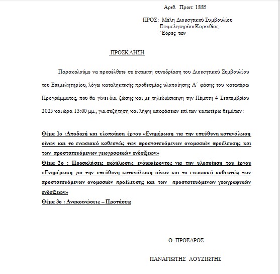 «Από δημοσιεύματα που συγκλόνισαν την τοπική κοινωνία και συγκεκριμένα του Korinthia24.gr μάθαμε ότι ΥΦΑΡΠΑΞΑΤΕ μία απόφαση του Δ.Σ για την υλοποίηση του έργου «Ενημέρωση για την υπεύθυνη κατανάλωση οίνων και το ενωσιακό καθεστώς των προστατευόμενων ονομασιών προέλευσης και των προστατευόμενων γεωγραφικών ενδείξεων».