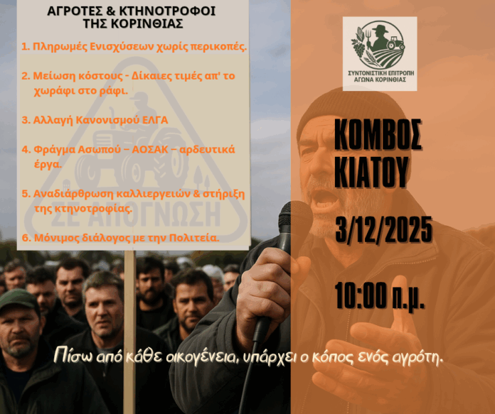 Καλούμε όλους τους παραγωγούς της Κορινθίας να δώσουν δυναμικό “παρών”. Η ευθύνη για τη βιωσιμότητα της υπαίθρου δεν μπορεί να παραμένει στα χαρτιά. Από εδώ και πέρα, η φωνή μας θα ακούγεται καθαρά, μόνιμα και σταθερά, με ενότητα και αξιοπρέπεια, μέχρι να υπάρξει πραγματική αλλαγή.