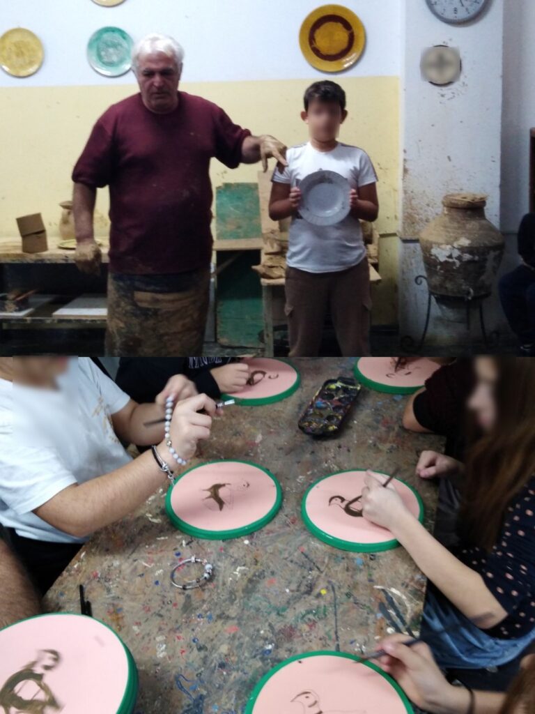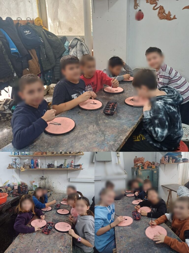 Στη συνέχεια, τα παιδιά συμμετείχαν σε δημιουργικό εργαστήριο και ζωγράφισαν πάνω σε πήλινες φόρμες. Οι μαθητές/τριες της Τετάρτης (Δ)΄ τάξης απέδωσαν απόσπασμα από τον ζωγραφικό διάκοσμο γεωμετρικού αγγείου, συγκεκριμένα από αγγείο του Διπύλου με παράσταση θρηνωδού, ενώ οι μαθητές/τριες της Πέμπτης (Ε΄) τάξης ζωγράφισαν ένα βυζαντινό διακοσμητικό θέμα από εφυαλωμένο πιάτο με παράσταση πέρδικας.
