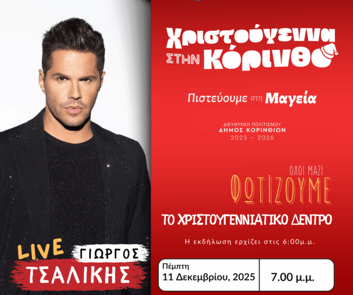 Λίγο αργότερα, στις 7.00, τη σκηνή αναλαμβάνει ο αγαπημένος Γιώργος Τσαλίκης, σε μια συναυλία γεμάτη ρυθμό, χαμόγελα και γιορτινή διάθεση που υπόσχεται να ξεσηκώσει όλη την Κόρινθο. Μουσική, φως και ζεστή ατμόσφαιρα θα δώσουν το σύνθημα για την έναρξη των πιο λαμπερών Χριστουγέννων των τελευταίων ετών.