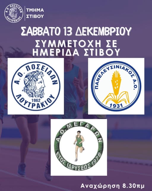 Σας ενημερώνουμε ότι η ομάδα στίβου του συλλόγου μας θα συμμετάσχει στην ημερίδα στίβου που διοργανώνει ο ΑΟ Μεγαρών, το Σάββατο 13 Δεκεμβρίου 2025, στα Μέγαρα.
