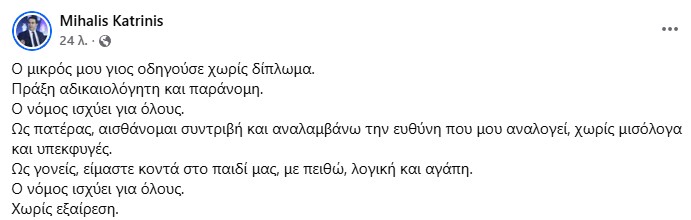 Ο βουλευτής του ΠΑΣΟΚ, Μιχάλης Κατρίνης, με ανάρτησή του στο Facebook, γνωστοποιεί πως ήταν ο δικός του ανήλικος γιος που οδηγούσε χωρίς δίπλωμα και συνελήφθη από την ΕΛ.ΑΣ.