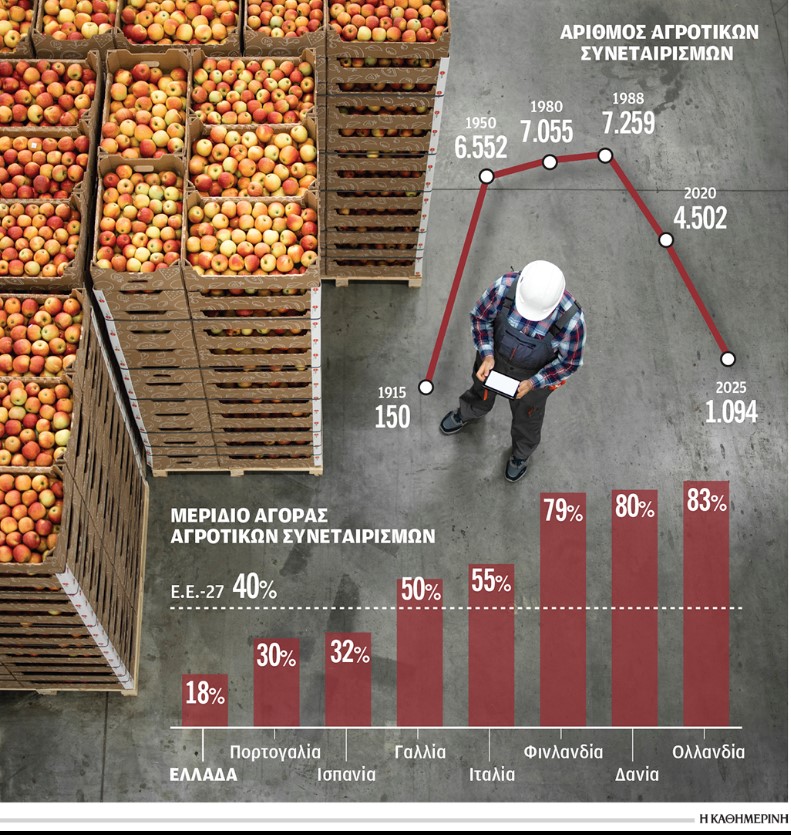 Ετσι, ενώ σε επίπεδο Ευρωπαϊκής Ενωσης το μερίδιο αγοράς των αγροτικών συνεταιρισμών φτάνει το 40%, στην Ελλάδα καταγράφεται μία από τις χαμηλότερες επιδόσεις, με το μερίδιο αγοράς των αγροτικών συνεταιρισμών να διαμορφώνεται σε περίπου 18%. Το υψηλότερο μερίδιο αγοράς αγροτικών συνεταιρισμών, 83%, καταγράφεται στην Ολλανδία, εκεί όπου δημιουργήθηκε η γνωστή μας FrieslandCampina με μέλη της 14.183 κτηνοτρόφους, τζίρο 12,92 δισ. ευρώ το 2024 και κέρδη 527 εκατ. ευρώ.