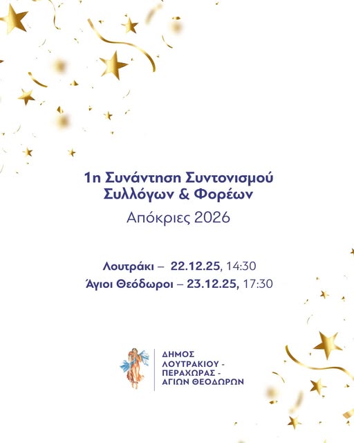 Δευτέρα 22 Δεκεμβρίου 2025, ώρα 14:30, στην αίθουσα του Δημοτικού Συμβουλίου Λουτρακίου (Ιάσονος & Εθνικής Αντιστάσεως).