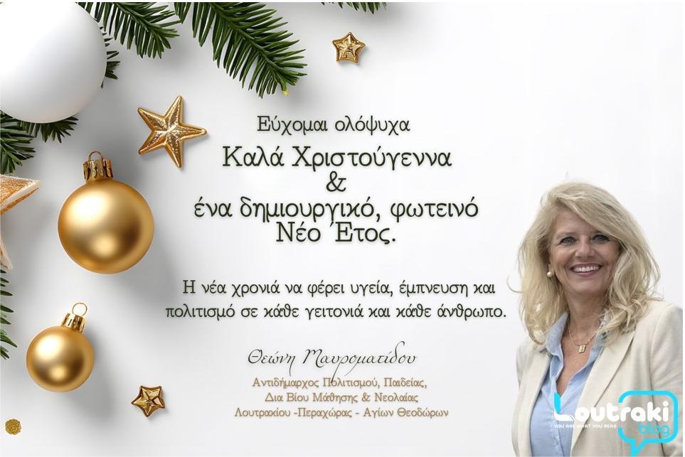 ΤΟΠΙΚΑΛουτράκι Χριστουγεννιάτικες ευχές από την Αντιδήμαρχο Πολιτισμού, Θεώνη Μαυροματίδου 22 Δεκεμβρίου 2025, 09:20 FacebookTwitterEmailCopy URLΤυπώνω - Advertisement - Η Αντιήμαρχος Πολιτισμού και Παιδείας του Δήμου Λουτρακίου-Περαχώρας-Αγίων Θεοδώρων κ. Θεώνη Μαυροματίδου, στέλνει τις ευχές της για τις γιορτές. - Advertisement - ΑΦΗΣΤΕ ΜΙΑ ΑΠΑΝΤΗΣΗ Ακύρωση απάντησης Σχόλιο: εισάγετε το σχόλιό σας! Όνομα: παρακαλώ εισάγετε το όνομά σας εδώ Email: έχετε εισάγει εσφαλμένη διεύθυνση ηλεκτρονικού ταχυδρομείου! παρακαλώ εισάγετε εδώ την ηλεκτρονική σας διεύθυνση Ιστοσελίδα: αποθηκεύστε το όνομα, το ηλεκτρονικό ταχυδρομείο και τον ιστότοπό μου σε αυτό το πρόγραμμα περιήγησης για την επόμενη φορά που θα σχολιάσω. Δ Δείτε ακόμα Λουτράκι Xριστουγεννιάτικες ευχές από την Ιχθυόεσσα Ελλάδα Εξαρθρώθηκε εγκληματική οργάνωση ναρκωτικών με δραστηριότητα σε σχολεία της Αττικής ΤΟΥΡΙΣΜΟΣ «Τουρισμός για Όλους»: Μέχρι πότε μπορούν οι πολίτες να εξαργυρώνουν την ψηφιακή κάρτα Κορινθία Κορινθία: Σε ποιες περιοχές θα έχει διακοπές ρεύματος αύριο, Δευτέρα Ελλάδα Χρ. Δήμας: Στα 2,5 εκατ. ευρώ την ημέρα το κόστος από το άνοιγμα των διοδίων από τους αγρότες Σχετικά άρθρα Λουτράκι Xριστουγεννιάτικες ευχές από την Ιχθυόεσσα Κορινθία Κορινθία: Σε ποιες περιοχές θα έχει διακοπές ρεύματος αύριο, Δευτέρα ΤΟΠΙΚΑ Κόρινθος: Τελευταίος απολογισμός πεπραγμένων Σταυρέλη πριν τα Χριστούγεννα Λουτράκι Ο παγκοσμίου φήμης Μιχάλης Δούκας αναβαθμίζει το Λαογραφικό Μουσείο Περαχώρας