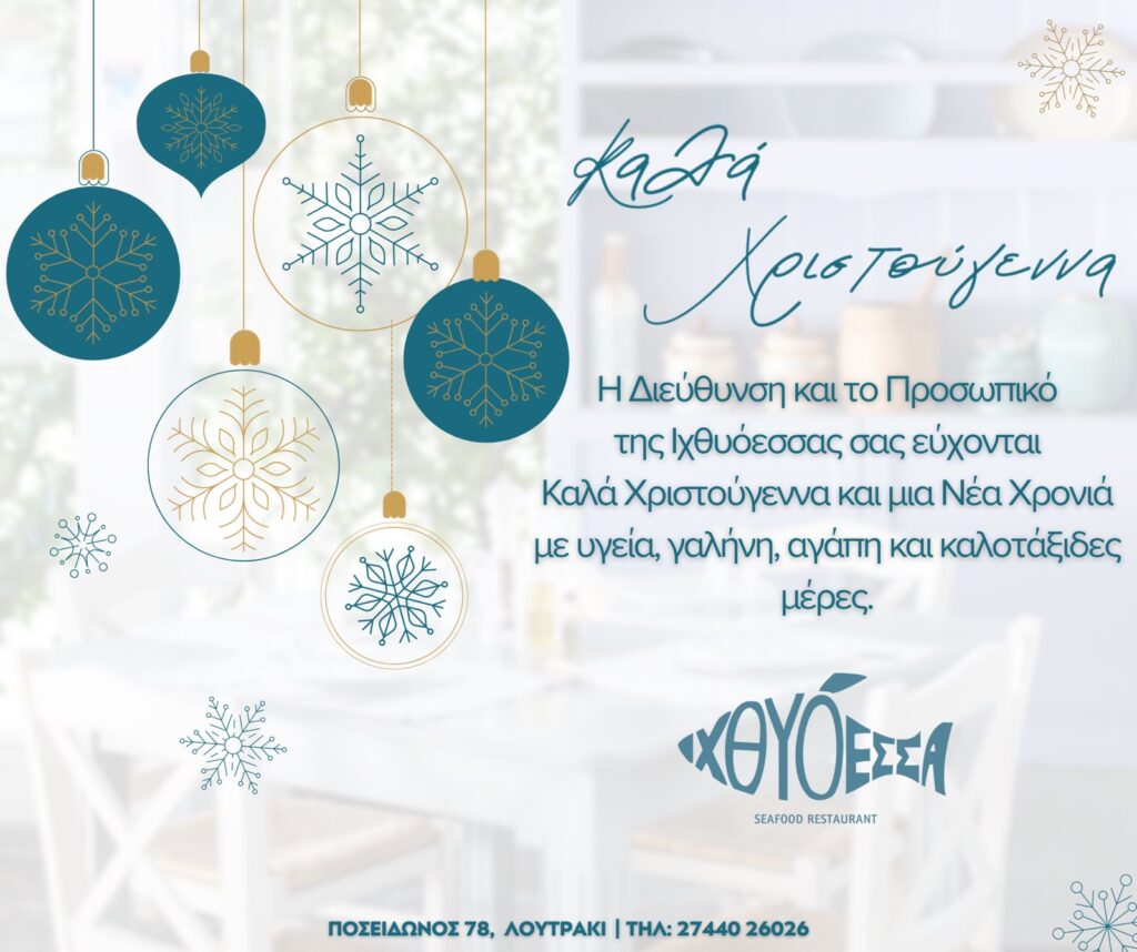 ΤΟΠΙΚΑΛουτράκι Xριστουγεννιάτικες ευχές από την Ιχθυόεσσα 22 Δεκεμβρίου 2025, 09:13 FacebookTwitterEmailCopy URLΤυπώνω - Advertisement - Η Διεύθυνση και το προσωπικό της Ιχθυόεσσας στο Λουτράκι, σας εύχονται Καλά Χριστούγεννα και μια Νέα Χρονιάμε υγεία, γαλήνη, αγάπη και καλοτάξιδες μέρες. - Advertisement - ΕΤΙΚΕΤΕΣΕΥΧΕΣ ΧΡΙΣΤΟΥΓΕΝΝΑΙΧΘΥΟΕΣΣΑ ΑΦΗΣΤΕ ΜΙΑ ΑΠΑΝΤΗΣΗ Ακύρωση απάντησης Σχόλιο: εισάγετε το σχόλιό σας! Όνομα: παρακαλώ εισάγετε το όνομά σας εδώ Email: έχετε εισάγει εσφαλμένη διεύθυνση ηλεκτρονικού ταχυδρομείου! παρακαλώ εισάγετε εδώ την ηλεκτρονική σας διεύθυνση Ιστοσελίδα: αποθηκεύστε το όνομα, το ηλεκτρονικό ταχυδρομείο και τον ιστότοπό μου σε αυτό το πρόγραμμα περιήγησης για την επόμενη φορά που θα σχολιάσω. Δ Δείτε ακόμα Λουτράκι Χριστουγεννιάτικες ευχές από την Αντιδήμαρχο Πολιτισμού, Θεώνη Μαυροματίδου Ελλάδα Εξαρθρώθηκε εγκληματική οργάνωση ναρκωτικών με δραστηριότητα σε σχολεία της Αττικής ΤΟΥΡΙΣΜΟΣ «Τουρισμός για Όλους»: Μέχρι πότε μπορούν οι πολίτες να εξαργυρώνουν την ψηφιακή κάρτα ΤΟΠΙΚΑ Κορινθία: Σε ποιες περιοχές θα έχει διακοπές ρεύματος αύριο, Δευτέρα Ελλάδα Χρ. Δήμας: Στα 2,5 εκατ. ευρώ την ημέρα το κόστος από το άνοιγμα των διοδίων από τους αγρότες Σχετικά άρθρα Λουτράκι Χριστουγεννιάτικες ευχές από την Αντιδήμαρχο Πολιτισμού, Θεώνη Μαυροματίδου ΤΟΠΙΚΑ Κορινθία: Σε ποιες περιοχές θα έχει διακοπές ρεύματος αύριο, Δευτέρα Κορινθία Κόρινθος: Τελευταίος απολογισμός πεπραγμένων Σταυρέλη πριν τα Χριστούγεννα Λουτράκι Ο παγκοσμίου φήμης Μιχάλης Δούκας αναβαθμίζει το Λαογραφικό Μουσείο Περαχώρας