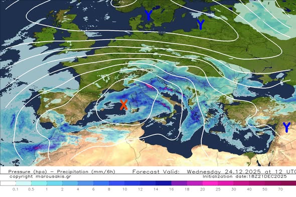Έτσι λοιπόν βαρομετρικό χαμηλό από την κεντρική Μεσόγειο θα επιδεινώσει τον καιρό στη χώρα μας το διάστημα 24 με 26 του μήνα με την κορύφωση αυτής της επιδείνωσης να αφορά κυρίως το διήμερο Τετάρτη και Πέμπτη δηλαδή παραμονή και ανήμερα των Χριστουγέννων.