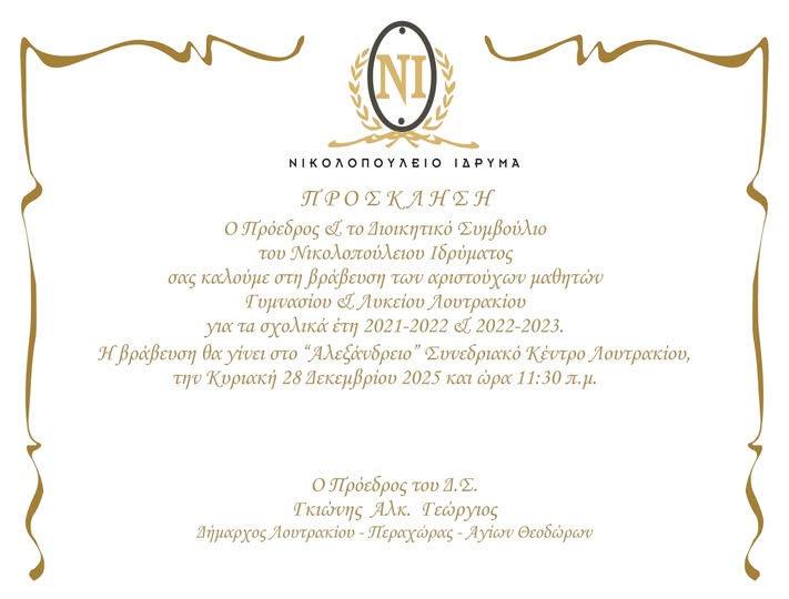 Την Κυριακή 28 Δεκεμβρίου 2025, στις 11:30 π.μ., στο Αλεξάνδρειο Συνεδριακό Κέντρο Λουτρακίου, θα πραγματοποιηθεί η βράβευση των αριστούχων μαθητών Γυμνασίου & Λυκείου Λουτρακίου για τα σχολικά έτη 2021–2022 & 2022–2023.