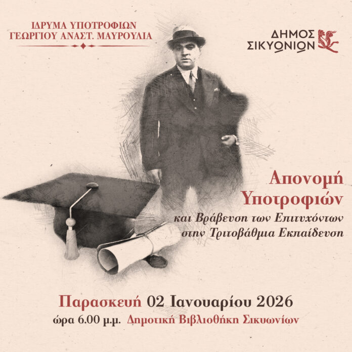 Ο Δήμος Σικυωνίων και το Ίδρυμα Υποτροφιών «Γεώργιος Αναστ. Μαυρούλιας» διοργανώνουν για άλλη μία χρονιά, την καθιερωμένη εκδήλωση απονομής υποτροφιών, την Παρασκευή 2 Ιανουαρίου 2026 και ώρα 6.00 μ.μ., στη Δημοτική Βιβλιοθήκη Σικυωνίων.