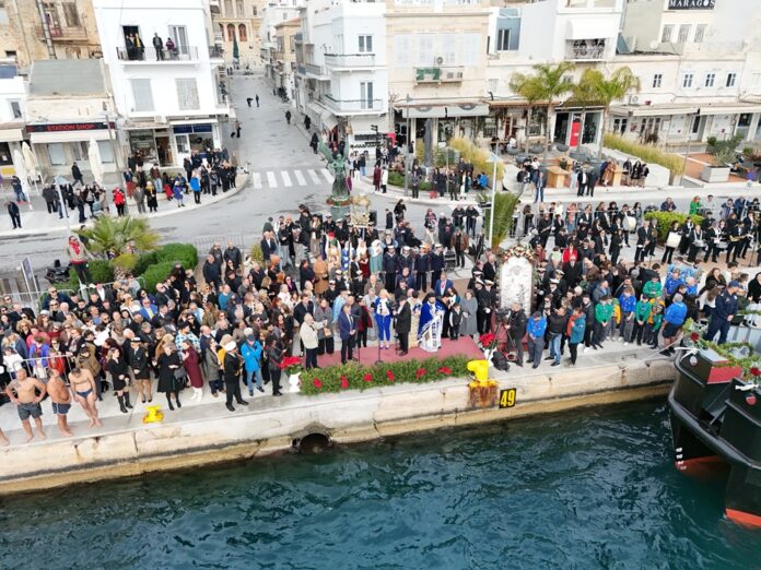 Παρουσία του υπουργού Αθλητισμού, Γιάννη Βρούτση και των αρχών του τόπου, πραγματοποιήθηκε το πρωί της Τρίτης 6 Ιανουαρίου η τελετή του αγιασμού των υδάτων στην Σύρο.