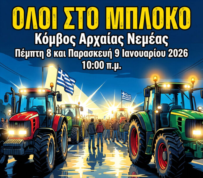 Σήμερα Πέμπτη 8 και την Παρασκευή 9 Ιανουαρίου 2026, στις 10:00 το πρωί, ενισχύουμε μπλόκο στον κόμβο της Αρχαίας Νεμέας και απευθύνουμε ανοιχτό, ξεκάθαρο και δημόσιο κάλεσμα συμπαράστασης: