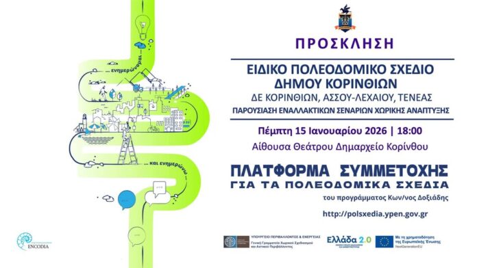 Ο Δήμος Κορινθίων σας προσκαλεί σε ανοιχτή εκδήλωση για την παρουσίαση των εναλλακτικών σεναρίων χωρικής ανάπτυξης στο πλαίσιο της μελέτης: