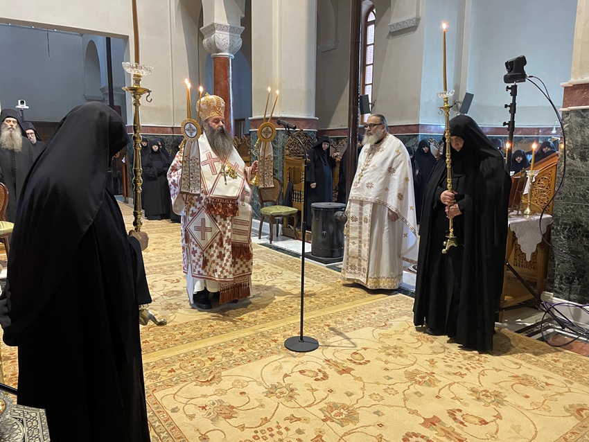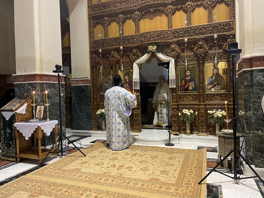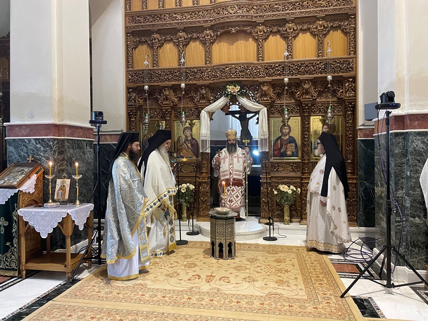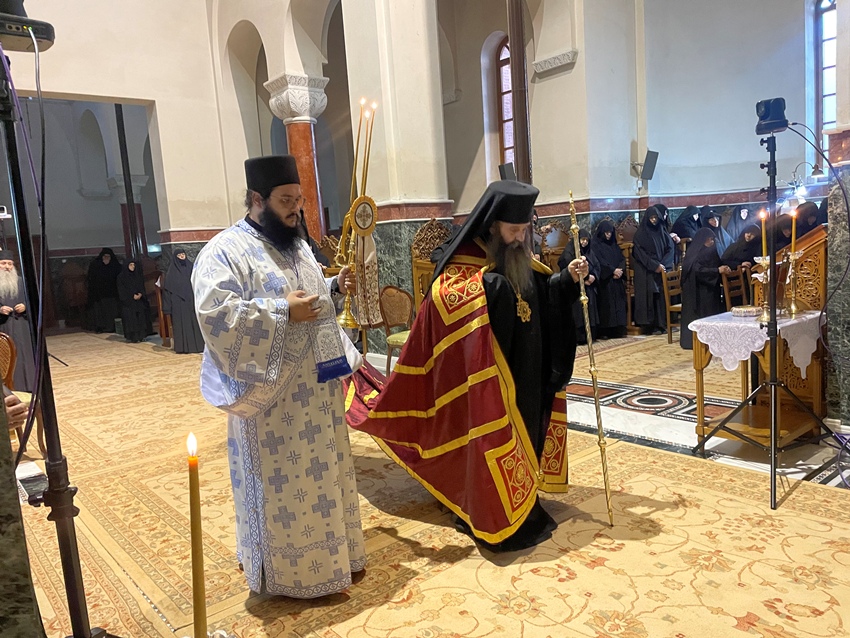 Αρχικά τελέσθηκε στο Καθολικό του Ι. Ησυχαστηρίου Αρχιερατική Θ. Λειτουργία από τον Πρωτοσύγκελο της Ι. Μητροπόλεως, Θεοφιλέστατο Επίσκοπο Κεγχρεών κ. Αγάπιο, συμπροσευχομένου του Σεβ. Μητροπολίτου Κορίνθου κ. Παύλου.
