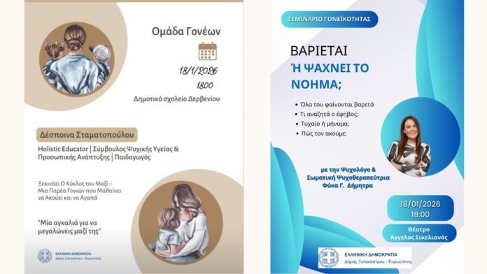 - Στο Δερβένι, στο Δημοτικό Σχολείο (ώρα 18:00): Η Δέσποινα Σταματοπούλου, Holistic Educator – Σύμβουλος Ψυχικής Υγείας & Προσωπικής Ανάπτυξης – Παιδαγωγός, συνεχίζει τη δράση της Ομάδας Γονέων: «Ο Κύκλος του Μαζί» Με κεντρικό σύνθημα «Μία αγκαλιά για να μεγαλώνεις μαζί της», η συνάντηση εστιάζει στη δημιουργία μιας ζεστής ομάδας γονέων που μαθαίνει να ακούει, να συνδέεται βαθιά και να προσφέρει αγάπη στα παιδιά με τρόπο υποστηρικτικό και ολιστικό.