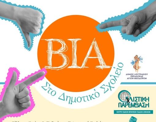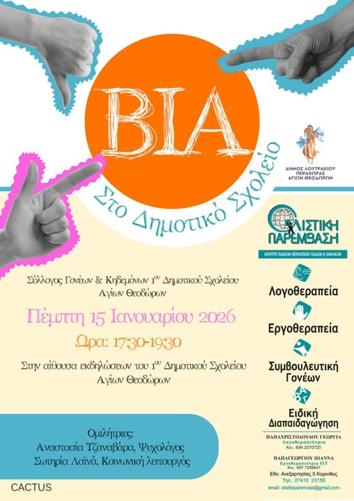 Ο Σύλλογος Γονέων & Κηδεμόνων του 1ου Δημοτικού Σχολείου Αγίων Θεοδώρων Κορινθίας, σε συνεργασία με το Κέντρο Ειδικών Θεραπειών «Ολιστική Παρέμβαση» και με την υποστήριξη του Δήμου Λουτρακίου – Περαχώρας – Αγίων Θεοδώρων, έχει την τιμή να σας προσκαλέσει σε ενημερωτική εκδήλωση με θέμα: «Βία στο Δημοτικό Σχολείο»