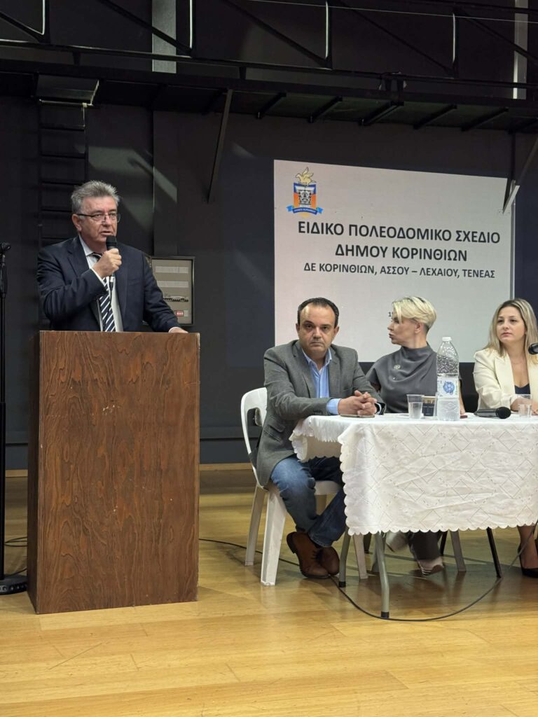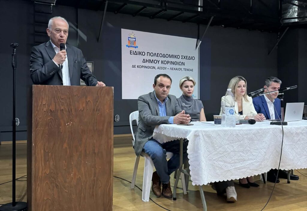 Με την παρουσία του Υφυπουργού Περιβάλλοντος και Ενέργειας, Νίκου Ταγαρά, και του Δημάρχου Κορινθίων, Νίκου Σταυρέλη, πραγματοποιήθηκε την Πέμπτη 15 Ιανουαρίου 2026, στην Αίθουσα Θεάτρου του Δημαρχείου Κορινθίων, η δημόσια παρουσίαση των εναλλακτικών σεναρίων χωρικής ανάπτυξης, στο πλαίσιο της μελέτης «Ειδικό Πολεοδομικό Σχέδιο (ΕΠΣ) Δήμου Κορινθίων (Δ.Ε. Κορίνθου, Άσσου-Λεχαίου και Τενέας)».
