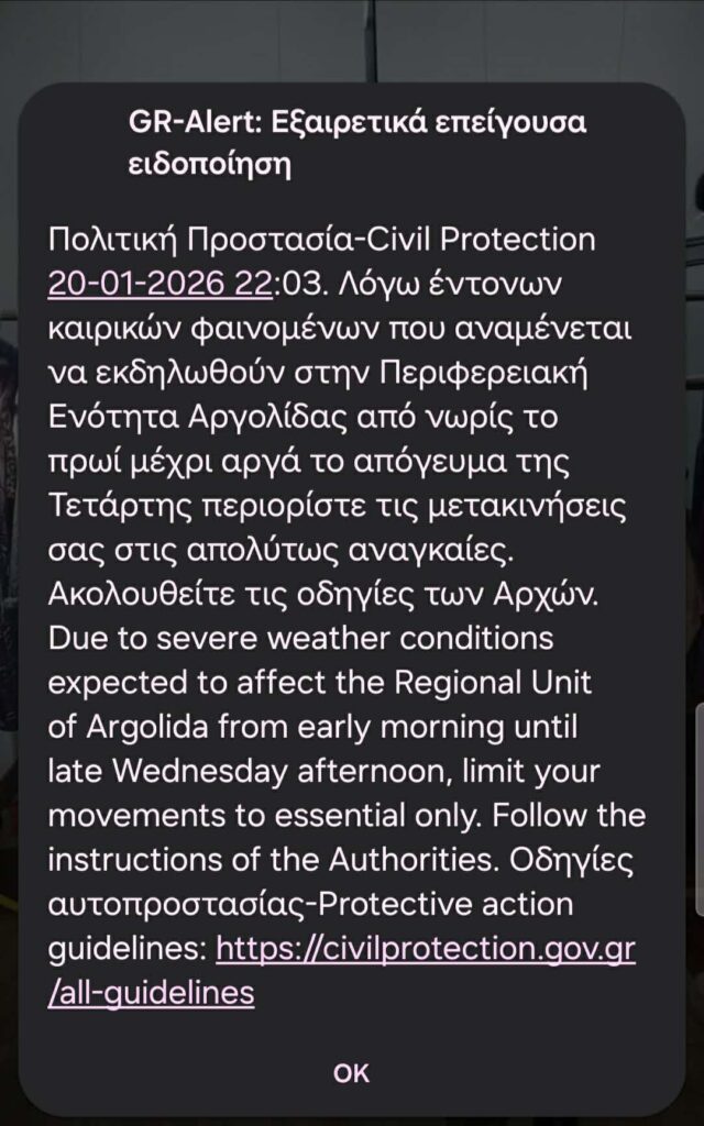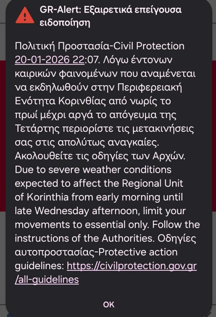 Η ισχυρή κακοκαιρία που αναμένεται να χτυπήσει την χώρα είναι προ των πυλών και οι πρώτες σειρήνες του 112 ήχησαν λίγο μετά τις 22:00 το βράδυ σε Κορινθία και Αργολίδα.