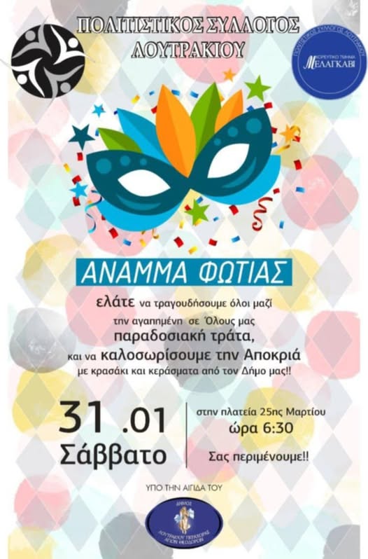 Ο Πολιτιστικός Σύλλογος Λουτρακίου σας προσκαλεί στο παραδοσιακό άνοιγμα του Τριωδίου, σε μια ξεχωριστή αποκριάτικη βραδιά γεμάτη κέφι, μουσική και παράδοση.