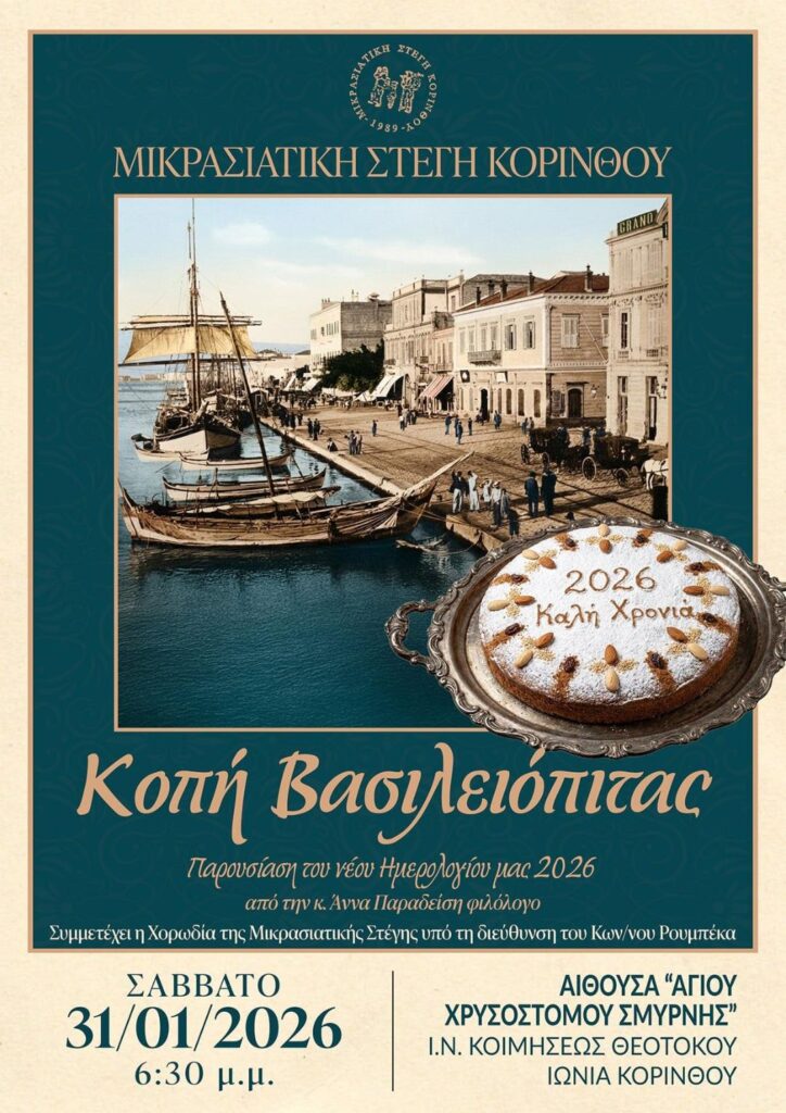 Η Μικρασιατική Στέγη Κορίνθου με ιδιαίτερη χαρά σας προσκαλεί να παραστείτε στην εκδήλωση για την κοπή της Βασιλειόπιτας του Συλλόγου, η οποία θα πραγματοποιηθεί στις 31/01/2026  και ώρα 18:30, στη αίθουσα Αγίου Χρυσοστόμου Σμύρνης του Ιερού Ναού Κοιμήσεως της Θεοτόκου στην Ιωνία Κορίνθου.
