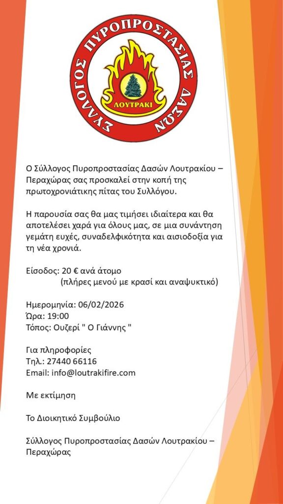 Ο Σύλλογος Πυροπροστασίας Δασών Λουτρακίου – Περαχώρας σας προσκαλεί στην εκδήλωση για την κοπή της Πρωτοχρονιάτικης Πίτας του, η οποία θα πραγματοποιηθεί στις 6 Φεβρουαρίου 2025, και ώρα 19:00, στο ουζερί «Ο Γιάννης», επί της οδού Γεωργίου Λέκκα 3, στο Λουτράκι. Τιμή εισόδου 20€ ανά άτομο με πλήρες μενού.