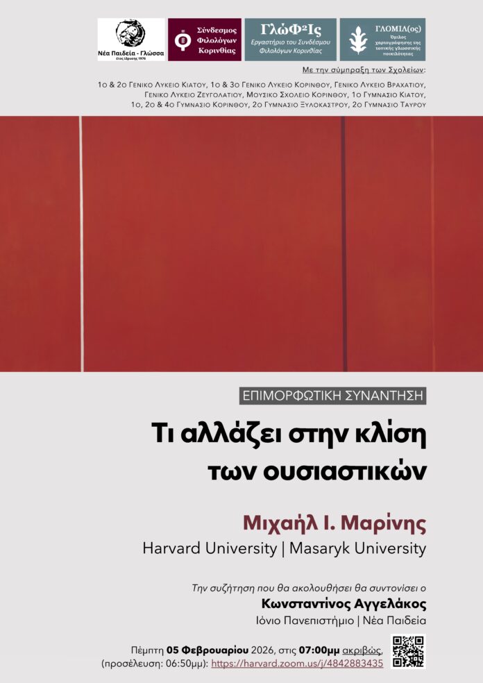 Θα θέλαμε να σας υπενθυμίσουμε την αυριανή εκδήλωσή μας, την Πέμπτη 5 Φεβρουαρίου 2026, με ομιλητή τον Δρ. Μιχαήλ Ι. Μαρίνη και τίτλο “Τι αλλάζει στην κλίση των ουσιαστικών”.