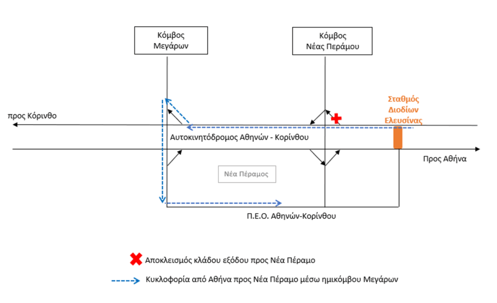 Στο πλαίσιο των εργασιών συντήρησης ασφαλτικών στρώσεων στο τμήμα Ελευσίνα-Κόρινθος, το Σάββατο 07/02/2026 από τις 07:00 το πρωί έως τις 18:00 το απόγευμα θα αποκλειστεί η έξοδος του κόμβου Νέας Περάμου (Χ.Θ. 33,4) με κατεύθυνση προς Κόρινθο. Η κυκλοφορία από Αθήνα προς Νέα Πέραμο θα εξυπηρετείται από τον αμέσως επόμενο κόμβο Μεγάρων (Χ.Θ. 38,9).