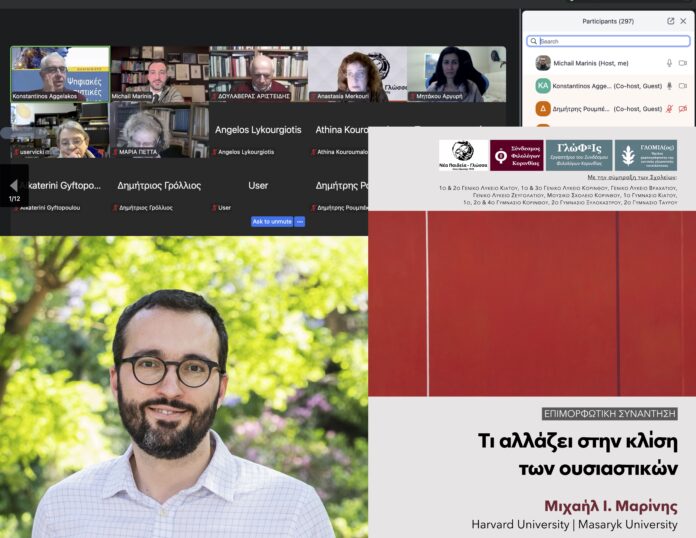 Με εξαιρετική επιτυχία και συμμετοχή που κάλυψε άμεσα τη μέγιστη χωρητικότητα της ψηφιακής πλατφόρμας, πραγματοποιήθηκε την Πέμπτη, 5 Φεβρουαρίου, η διαδικτυακή διάλεξη με τίτλο «Τι αλλάζει στην κλίση των ουσιαστικών». Κεντρικός ομιλητής ήταν ο γλωσσολόγος Μιχαήλ Ι. Μαρίνης (Masaryk University & Harvard University), ενώ την εκδήλωση συντόνισε ο Κώστας Αγγελάκος (Ιόνιο Πανεπιστήμιο).