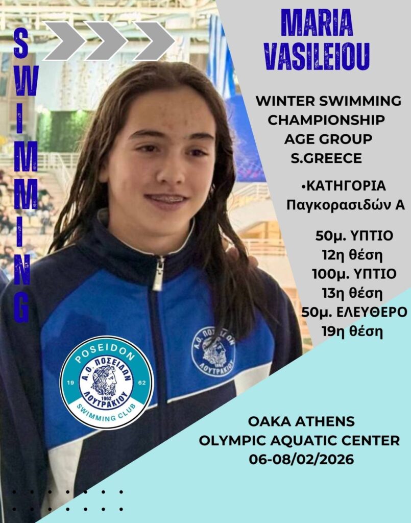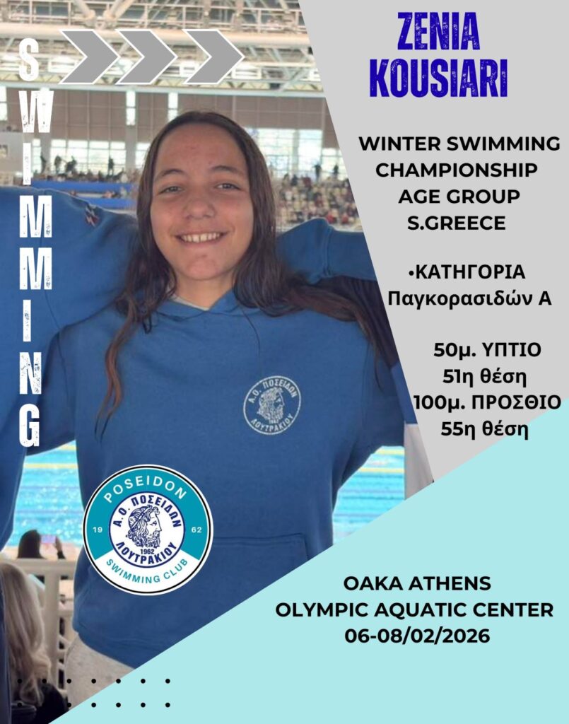 Πιστό στα αγωνιστικά του ραντεβού με τα Πανελλήνια Πρωταθλήματα, το τμήμα κολύμβησης του ΑΟ ΠΟΣΕΙΔΩΝ ΛΟΥΤΡΑΚΙΟΥ συμμετείχε για μία ακόμη φορά στο πολυπληθές “ΧΕΙΜΕΡΙΝΟ ΠΡΩΤΑΘΛΗΜΑ ΝΟΤΙΟΥ ΕΛΛΑΔΟΣ ΠΠΑΒ-ΠΚΑΒ 2026” το οποίο διεξήχθη στο Ολυμπιακό Αθλητικό Κέντρο Αθηνών «Σπύρος Λούης» από 06-08 Φεβρουαρίου 2026 με τη συμμετοχή 92 σωματείων και 838 κολυμβητριών και κολυμβητών.