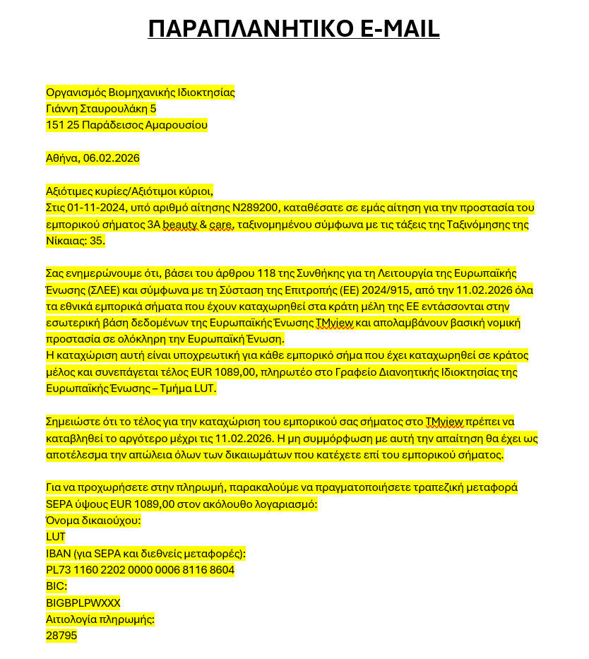 Ο Οργανισμός Βιομηχανικής Ιδιοκτησίας (ΟΒΙ) ενημερώνει το κοινό ότι κατά το τελευταίο εικοσιτετράωρο έχουν εντοπιστεί περιστατικά ηλεκτρονικής απάτης, τα οποία αφορούν στην αποστολή παραπλανητικών ηλεκτρονικών μηνυμάτων στους καταθέτες /δικαιούχους εμπορικών σημάτων, με αιτήματα καταβολής τελών που φέρονται να σχετίζονται με υπηρεσίες του Οργανισμού.