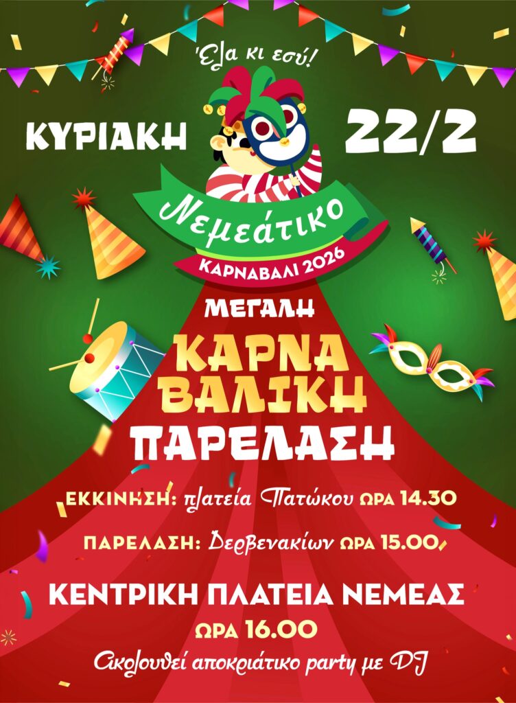 Με κέφι, χρώμα, μουσική και σατιρική διάθεση, το Νεμεάτικο Καρναβάλι υπόσχεται μια ημέρα γεμάτη ζωντάνια και χαμόγελα, καλώντας όλους να συμμετάσχουν στη γιορτή.