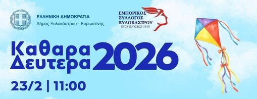 Ο Δήμος Ξυλοκάστρου – Ευρωστίνης, σε συνεργασία με τον Εμπορικό Σύλλογο Ξυλοκάστρου, σας προσκαλεί στον εορτασμό της Καθαράς Δευτέρας 2026, την Δευτέρα 23 Φεβρουαρίου στις 11:00 π.μ. στην Πλατεία Αγίου Βλασίου.